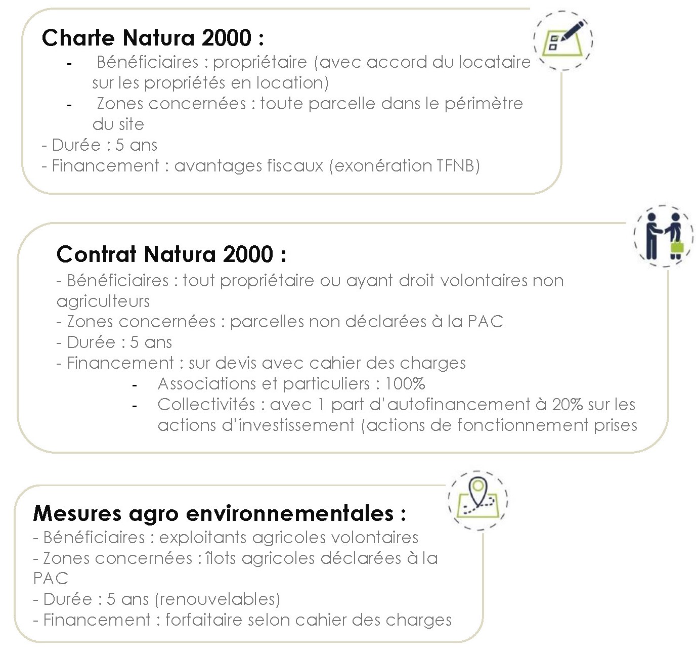 Plusieurs dispositifs sont accessibles aux particuliers, aux professionnels et aux collectivités : le contrat Natura 2000, les mesures agro-environnementales territorialisées et la charte natura 2000.